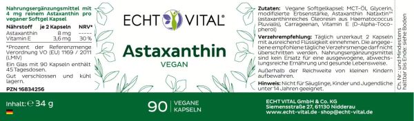 Vegane Softgelkapsel: MCT-Öl, Glycerin, modifizierte Erbsenstärke, Astaxanthin Nataxtin™ (astaxanthinreiches Oleoresin aus Haematococcus Pluvialis), Carrageenan, Vitamin E (D-Alpha-Tocopherol)
