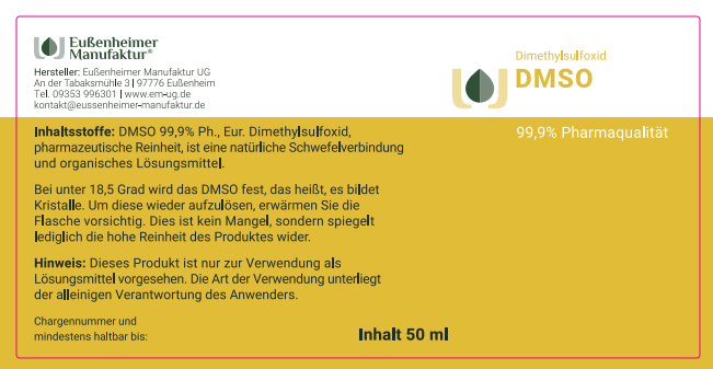 Inhaltstoffe: DMSO 99,9 % Ph, Eur. Dimethylsulfoxid, pharmazeutische Reinheit, ist eine natürliche Schwefelverbindung und organisches Lösungsmittel Inhalt 50 ml Pipettenflasche