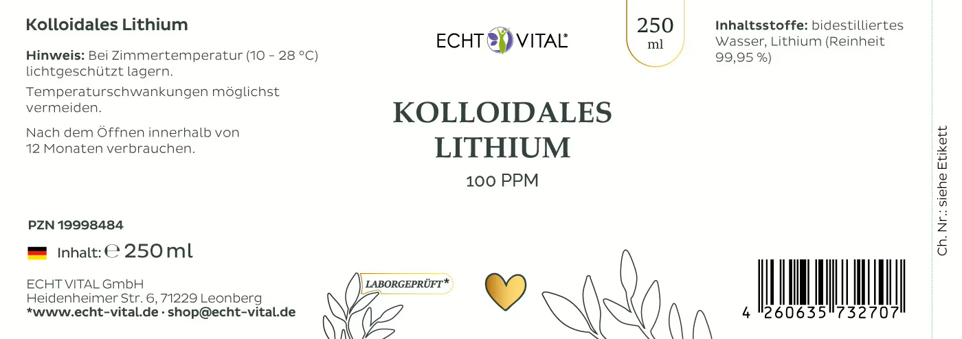 Die Echt Vital Lösung enthält hochreines kolloidales Lithium in einer Konzentration von 100 ppm – hergestellt aus sorgfältig ausgewählten Rohstoffen und reinem, bidestilliertem Wasser.