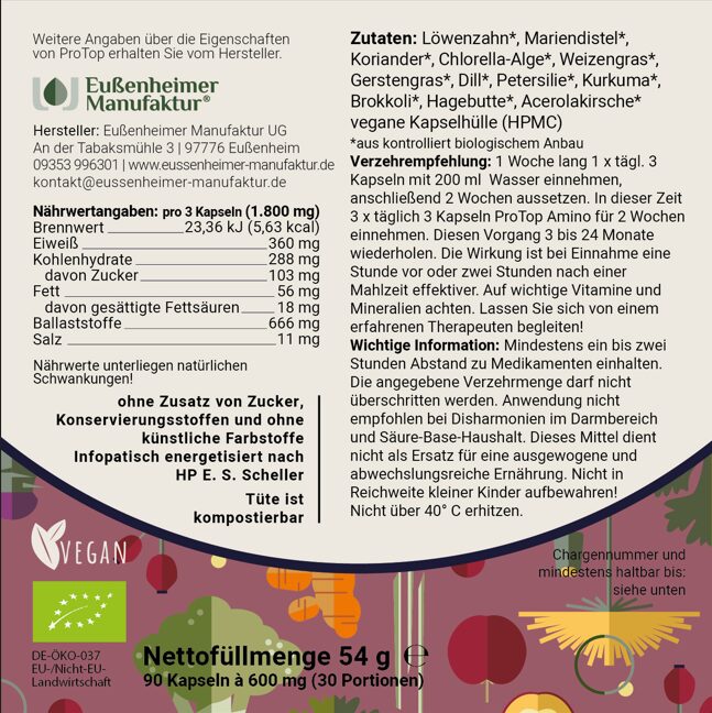 Die ProTop LeberKur ist ein natürliches, pflanzliches Lebensmittel aus kontrolliert biologischem Anbau in Deutschland. Die Mischung wird schonend verarbeitet, von Hand hergestellt und ist zu 100 % vegan sowie frei von Zusatzstoffen. Durch ihren präbiotischen Charakter passt sie ideal in eine moderne, pflanzenbasierte Ernährung.