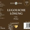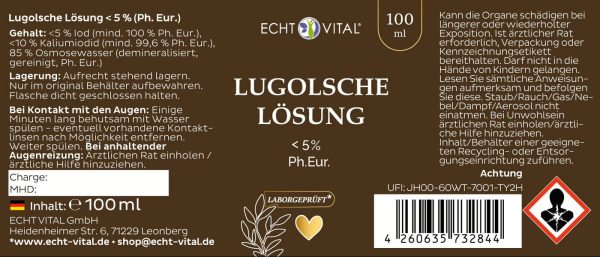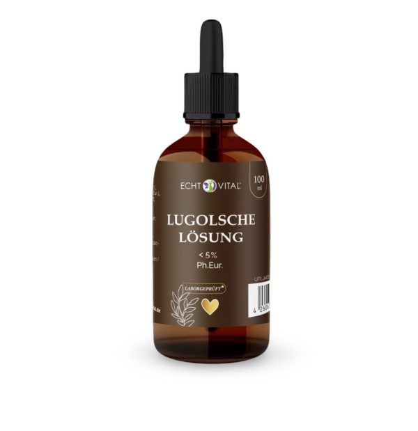 Lugolsche Lösung < 5 % Ph. Eur. 100 ml – elementares Iod (< 5 %) und Kaliumiodid (< 10 %) in hochwertigem, demineralisiertem Wasser (Ph. Eur.).