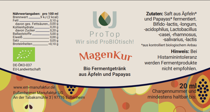 Unsere MagenKur ist ein Getränk für den Magen, durch den Einsatz hochwertiger fermentierter Pflanzen, wie Apfel und Papaya.  Äpfel sind natürliche Verdauungshelfer. Sie sind dafür bekannt die  Bildung von Verdauungssäften und Enzymen unterstützen und auf diese Weise die Verdauung anregen.