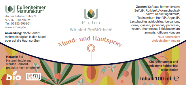 Es ist medizinisch erwiesen, dass Haut und Schleimhäute ohne eine ausgewogene Mikrobenbalance nicht gesund funktionieren können. Unser ProTop Mund- & Hautspray nutzt die breit gefächerten Möglichkeiten von Effektiven Mikroorganismen.