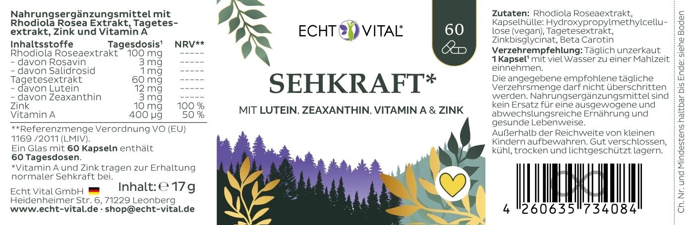 Rhodiola Roseaextrakt, Kapselhülle: Hydroxypropylmethylcellulose (vegan), Tagetesextrakt, Zinkbisglycinat, Beta Carotin