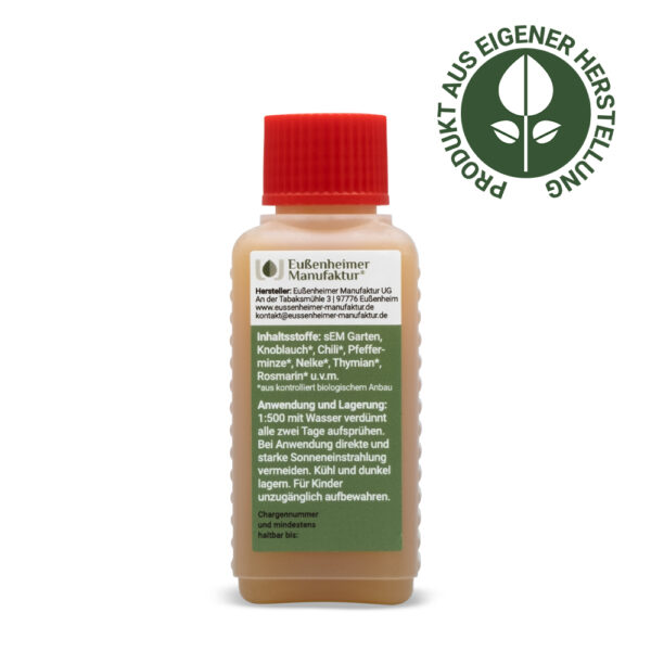 Die kraftvolle Mischung aus Knoblauch, Chili, Nelke, Thymian, Rosmarin, Pfefferminze, Molke und 85 Bakterienstämmen macht es für Schädlinge ein extrem unangenehmes Extrakt, während es für Bienen, Hummeln, Regenwürmer, Haustiere und Kinder völlig unbedenklich ist.