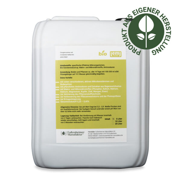 Unser sEM Flüssigdünger BIO ist ein nachhaltiger Bodenhilfsstoff aus effektiven Mikroorganismen und Aminosäuren aus Regenwurmhumus, der das Pflanzenwachstum auf natürliche Weise fördert. Bodenbakterien verbessern die Nährstoffverfügbarkeit, Bodenstruktur und Pflanzenschutz, was zu gesünderen Pflanzen führt.