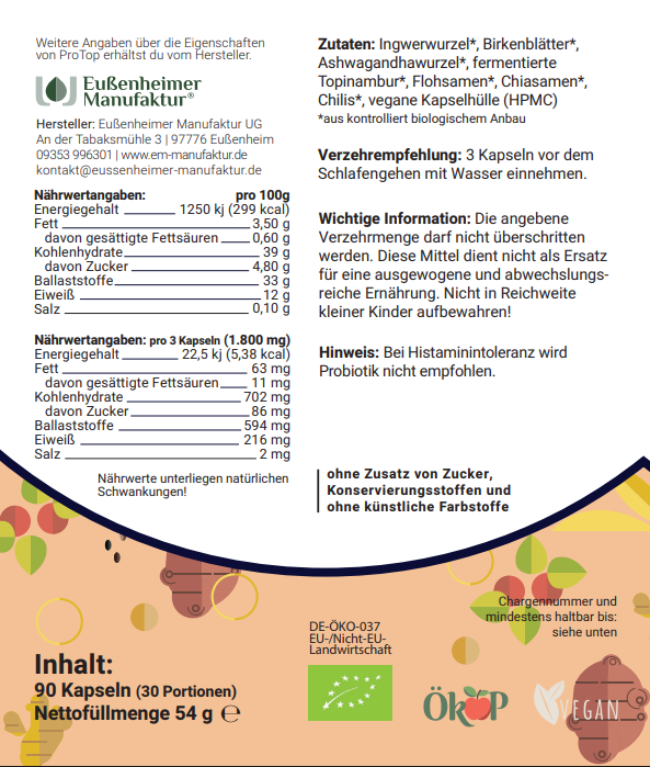 Zutaten: Ingwerwurzel*, Birkenblätter*, Ashwagandhawurzel*, fermentierte Topinambur*, Chillis*, Flohsamen*, Chiasamen*, vegane Kapselhülle (HPMC) *aus kontrolliert biologischem AnbauDE-ÖKO-037 EU-/Nicht-EU-LandwirtschaftVerzehrempfehlung: 3 Kapseln vor dem Schlafengehen mit Wasser einnehmen.Nettofüllmenge 54 g 90 Kapseln a. 600 mg (30 Portionen)