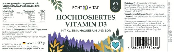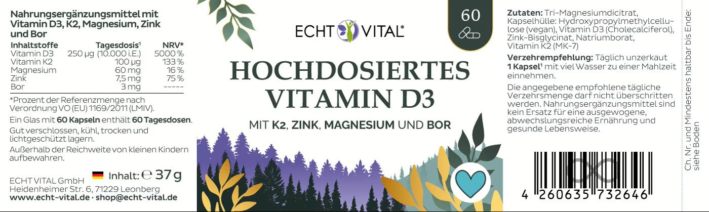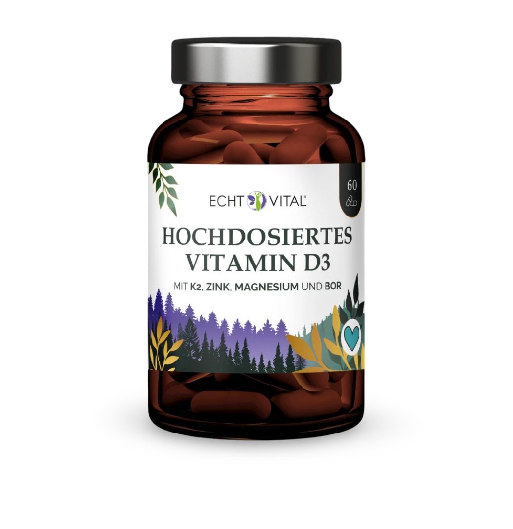 Der Echt Vital Vitamin D3 Komplex kombiniert hochdosiertes Vitamin D3 mit ausgewählten Co-Faktoren für eine gezielte Nährstoffversorgung.
